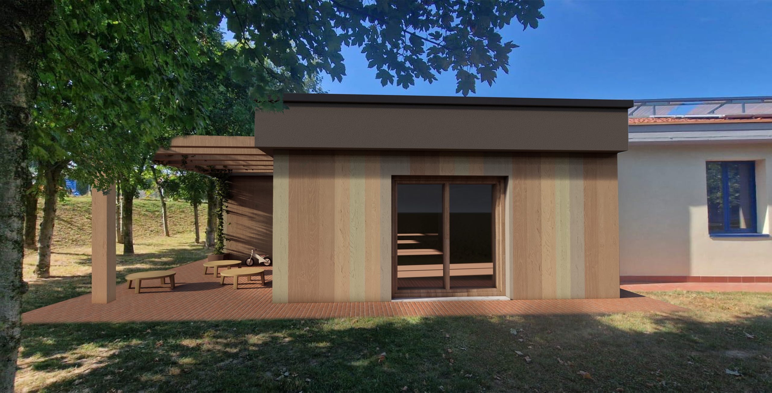 Il nuovo corpo di fabbrica si inserisce all’interno di un lotto già urbanizzato, caratterizzato da ampi spazi verdi e da un contesto residenziale consolidato. L’edificio esistente, oggi articolato in volumi e coperture eterogenee, viene affiancato da un ampliamento a un solo piano fuori terra, compatto e riconoscibile, con copertura piana e linguaggio architettonico sobrio e contemporaneo. Le altezze contenute e l’organizzazione razionale degli spazi interni ed esterni assicurano una perfetta integrazione funzionale e visiva con il complesso scolastico esistente.