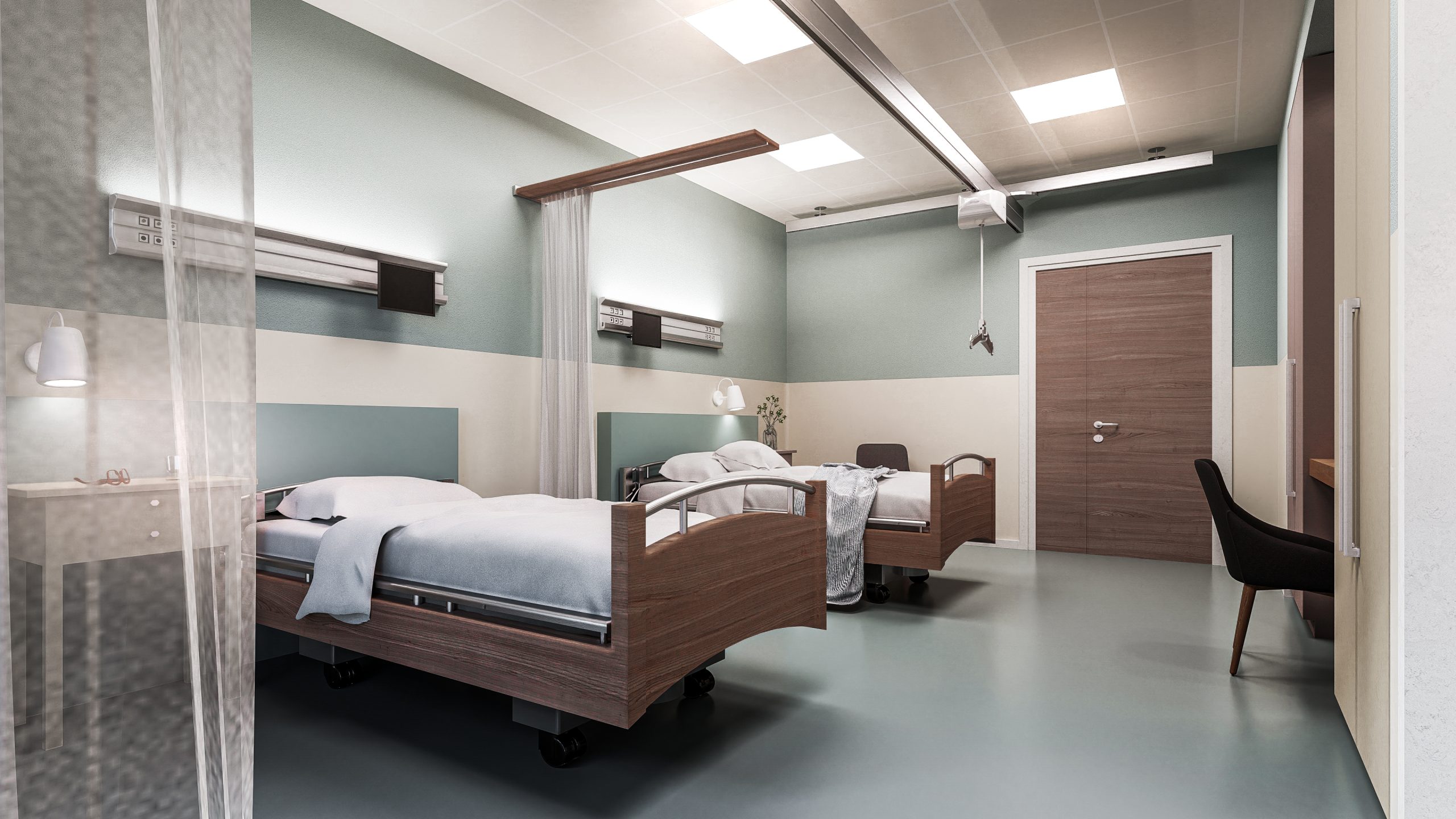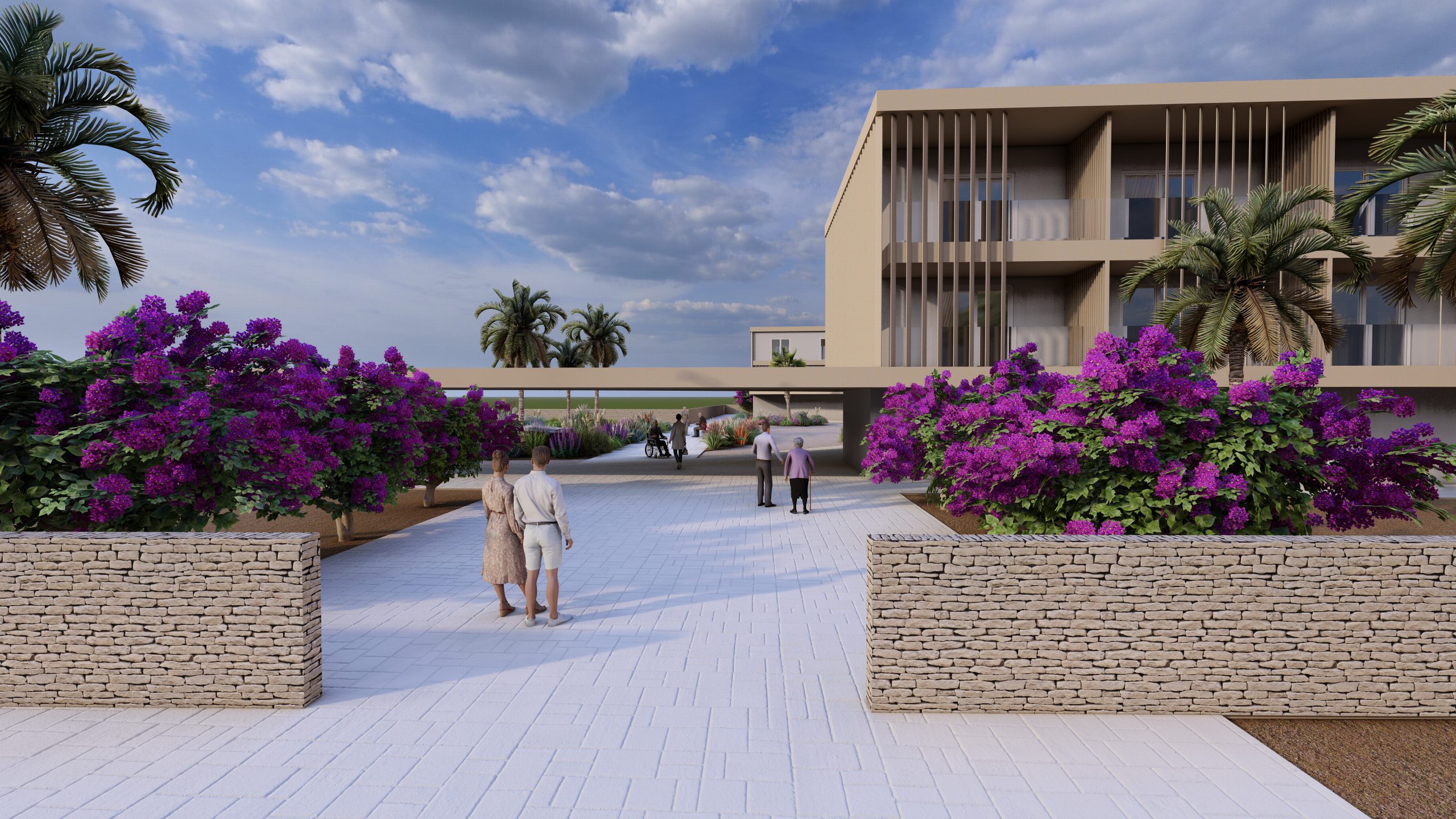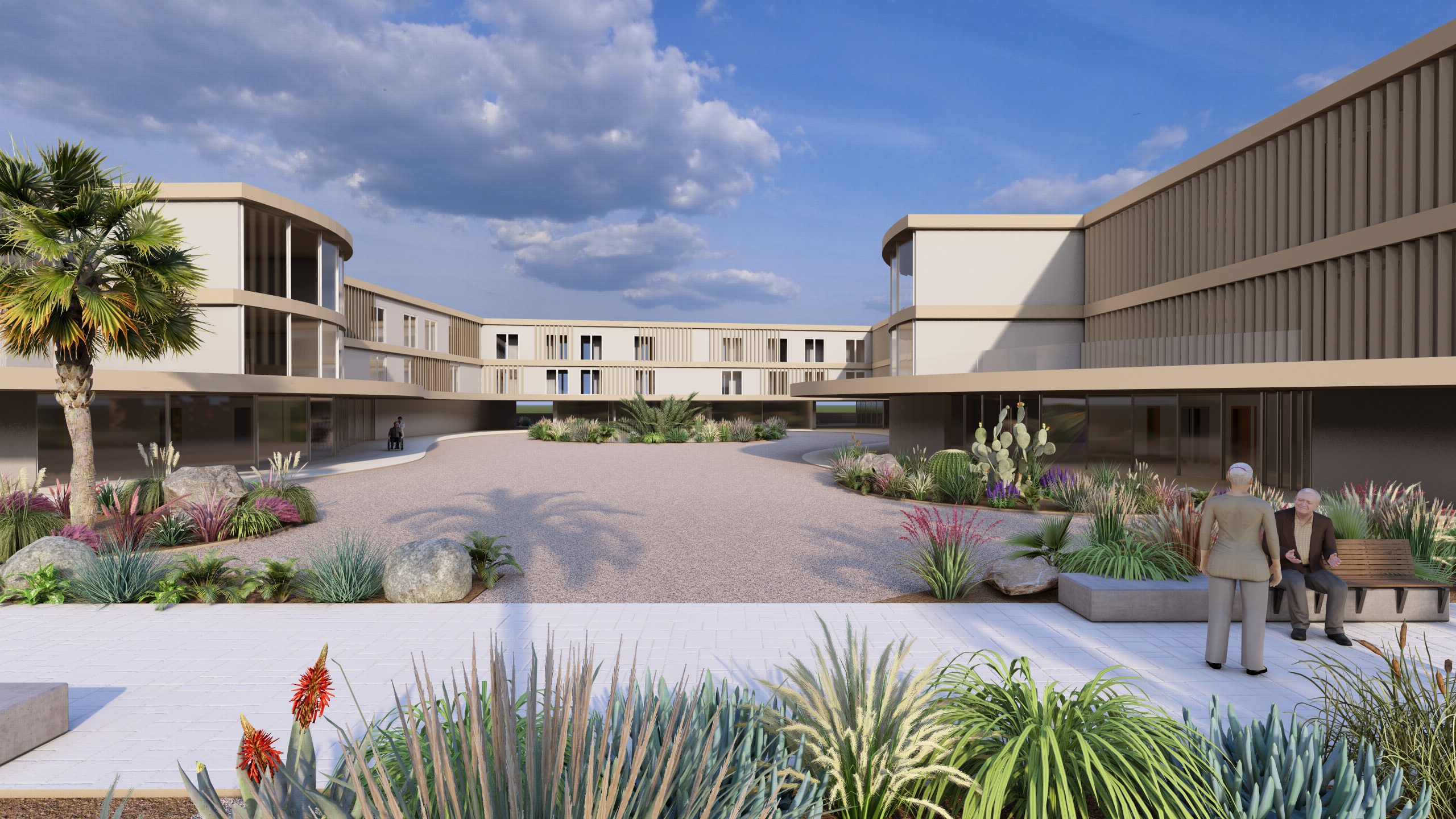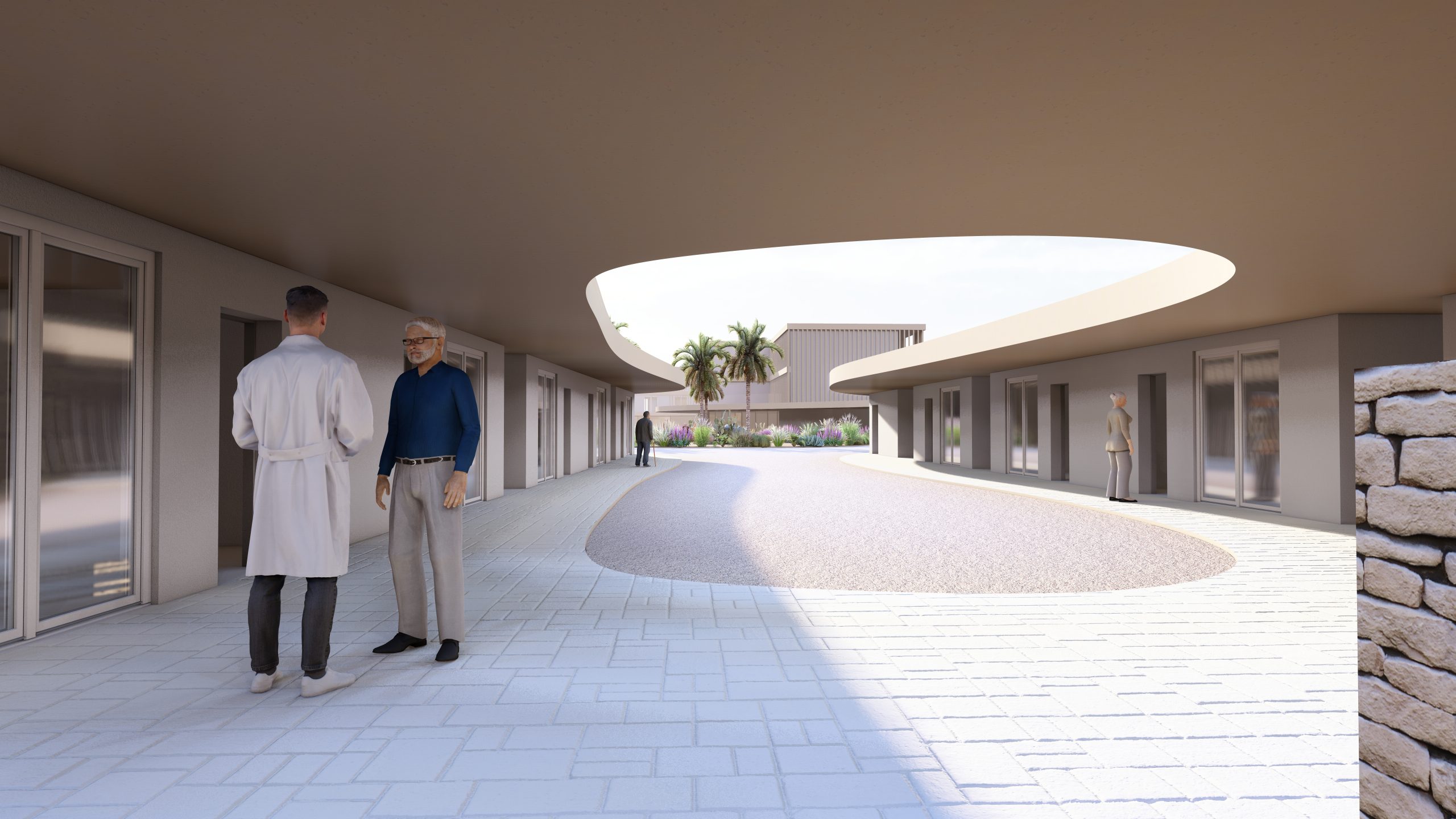 Piano Terra (Il Centro Relazionale): Concepito come una struttura pubblica polivalente, ospita l’hub amministrativo, la palestra riabilitativa, il centro diurno, la caffetteria e la sala di culto. Gli spazi sono fluidi, con “pareti attive” e arredi caldi che favoriscono scambi intergenerazionali e attività sociali.