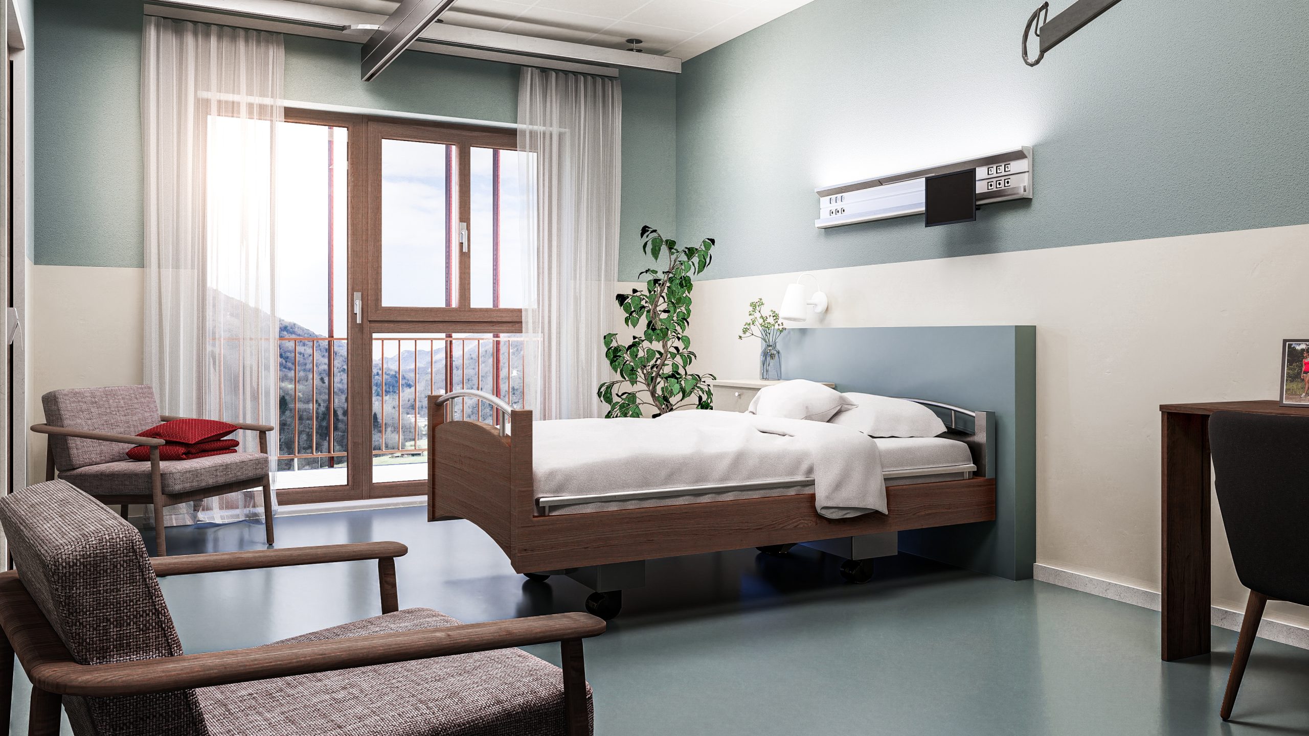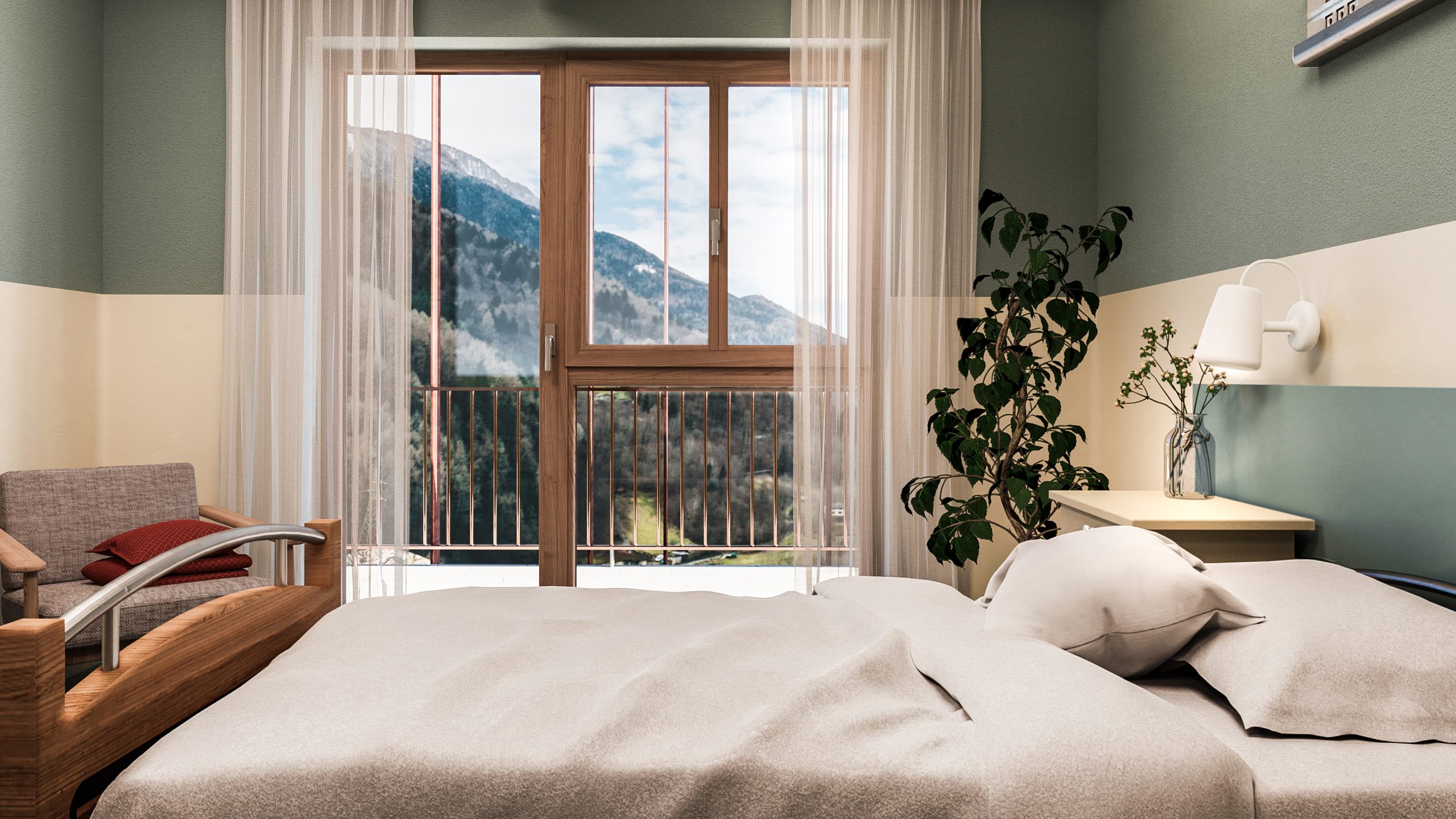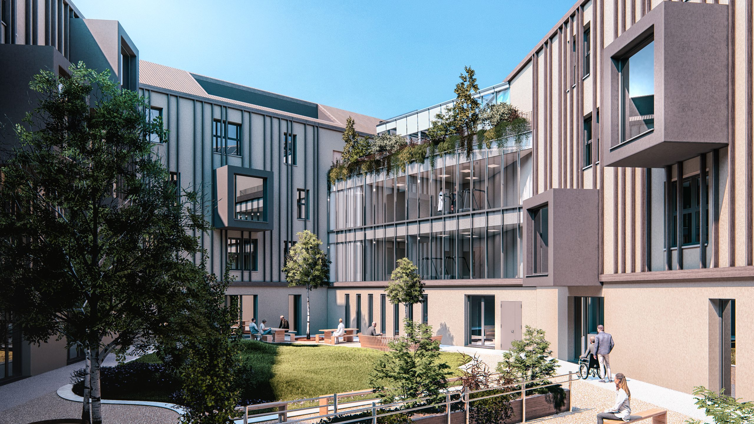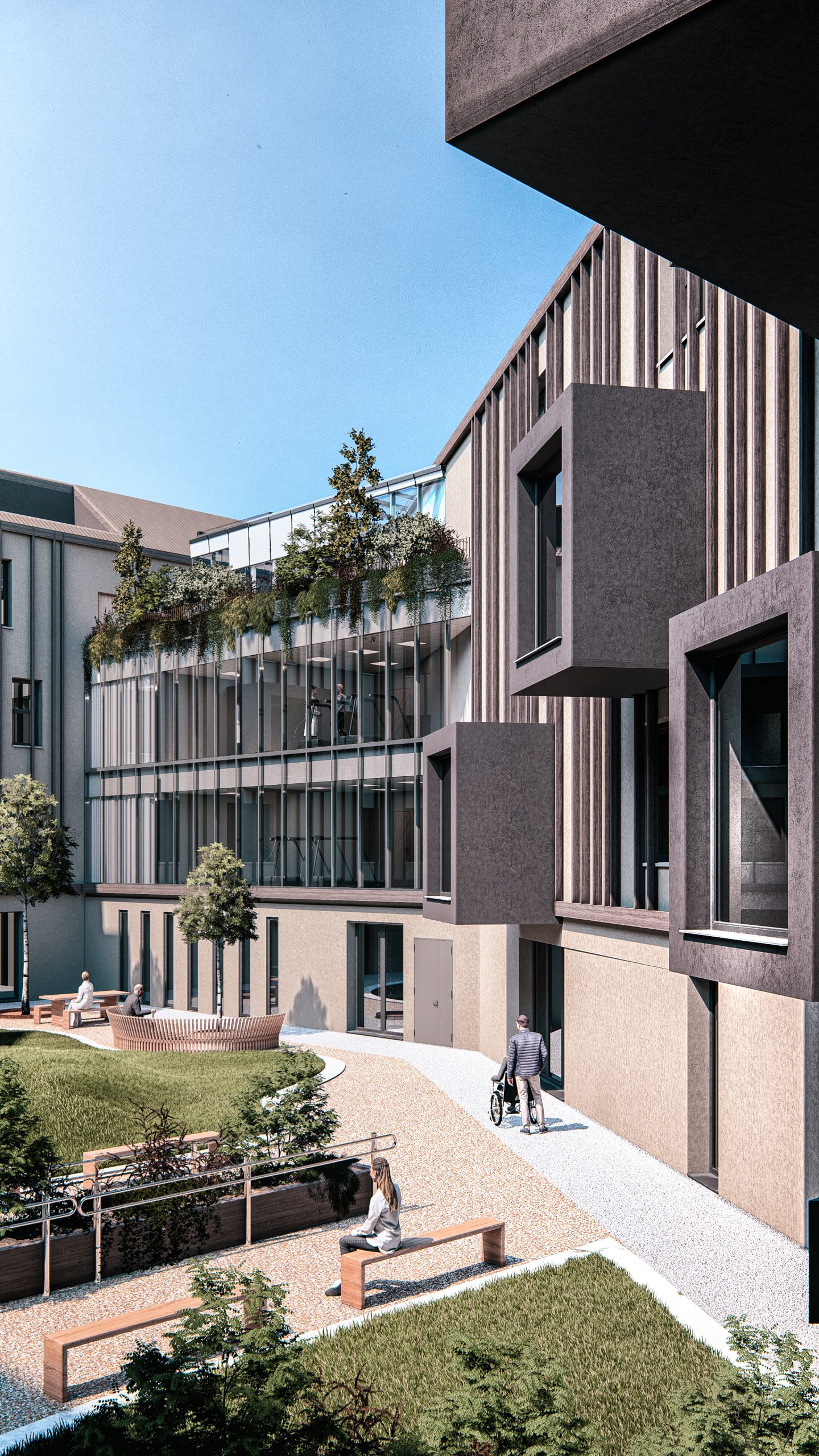 Piani Superiori (I Nuclei Residenziali): Ospitano nuclei da 20 posti letto ciascuno. La distribuzione è studiata per ridurre l’effetto “ospedaliero”: i corridoi sono intervallati da spazi di sosta a sbalzo sulla corte, trasformandosi in luoghi di socialità. Al terzo piano, il Nucleo Alzheimer gode di un giardino d’inverno protetto, permettendo il contatto con il verde in totale sicurezza.