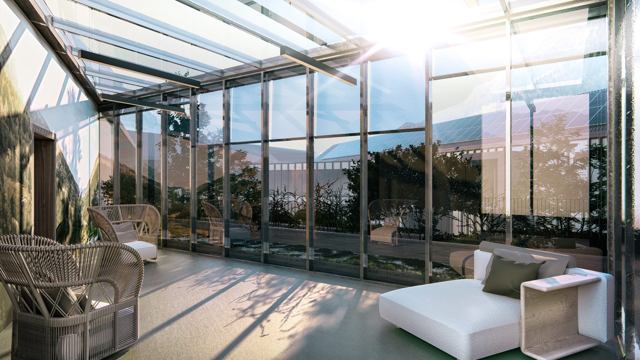 Situato in una posizione strategica tra tre valli, l’edificio si presenta con una forma organica a corte aperta (a “ventaglio”), che media tra il linguaggio contemporaneo e i rimandi alla tradizione alpina. La scelta morfologica non è solo estetica: la corte interna funge da cuore protetto e baricentrico, mentre le ali dell’edificio si protendono verso l’esterno, garantendo a quasi tutte le camere un’esposizione ottimale (sud, est, ovest) e una connessione visiva costante con il panorama montano.