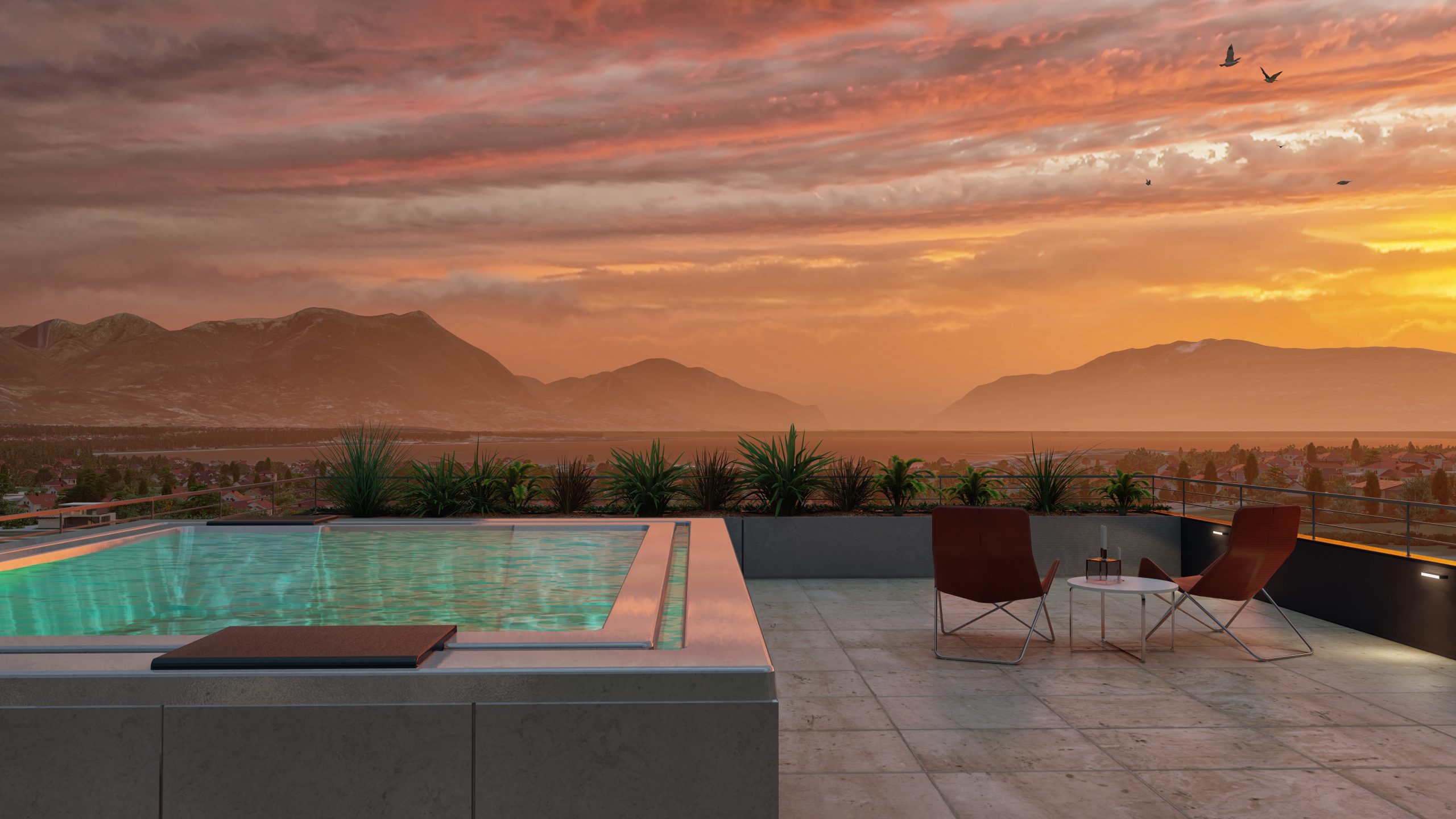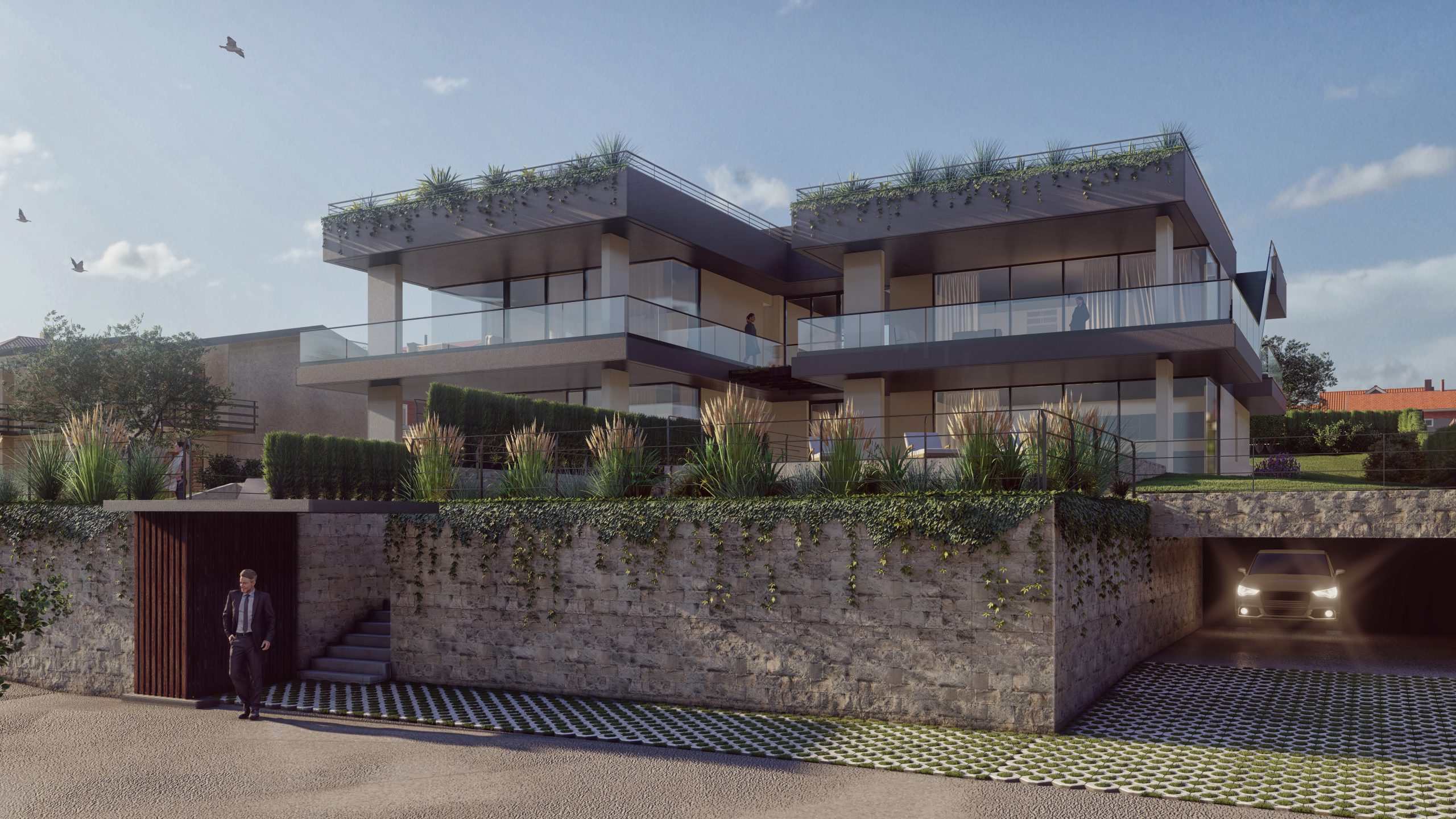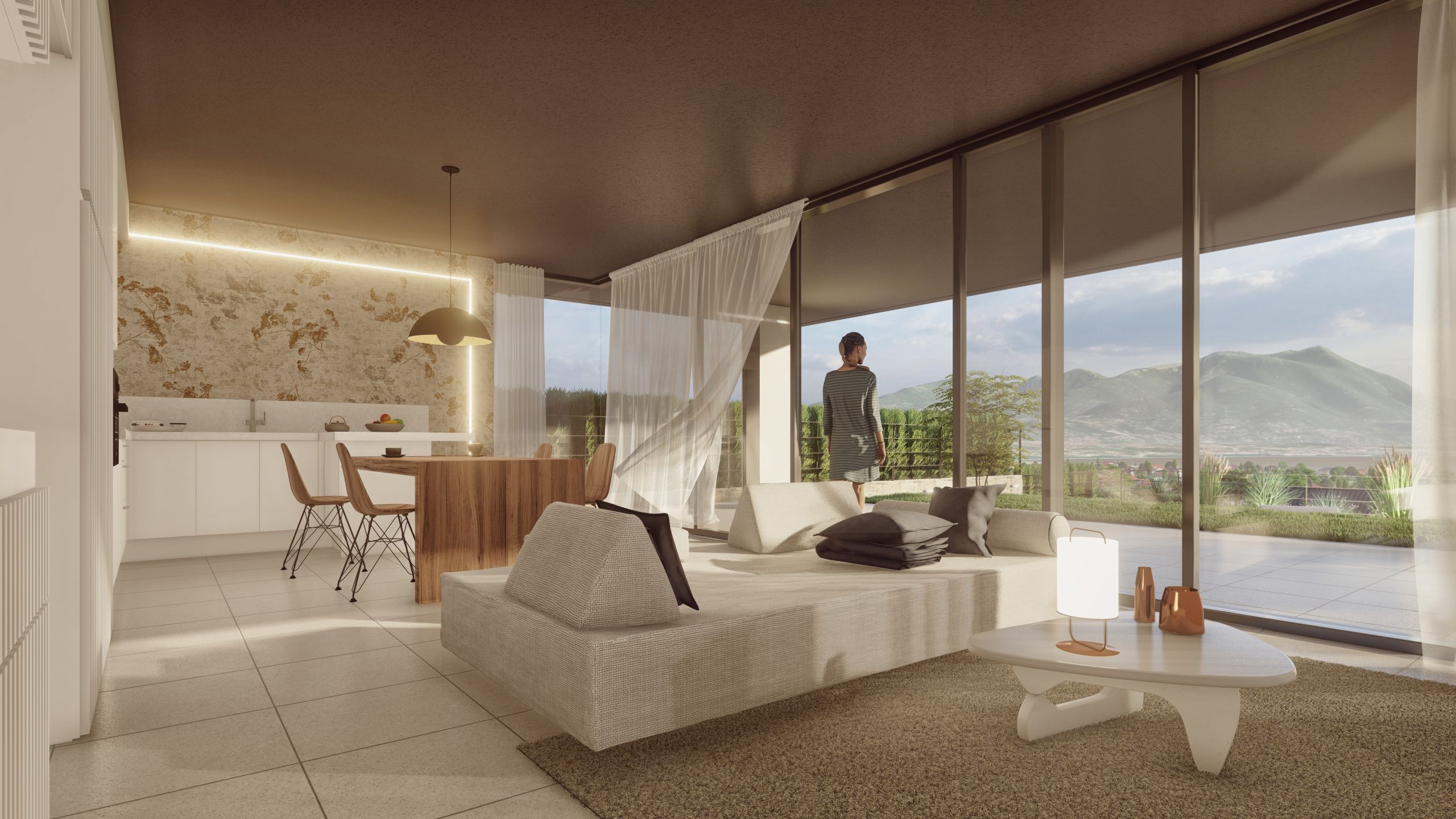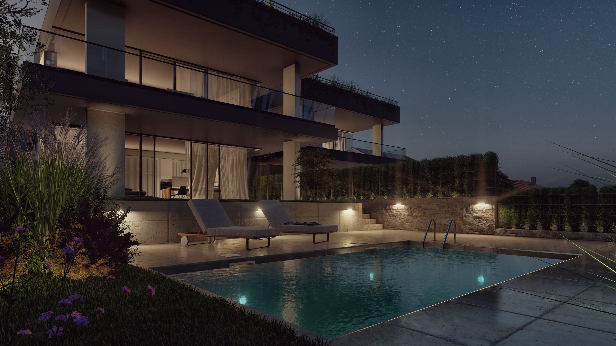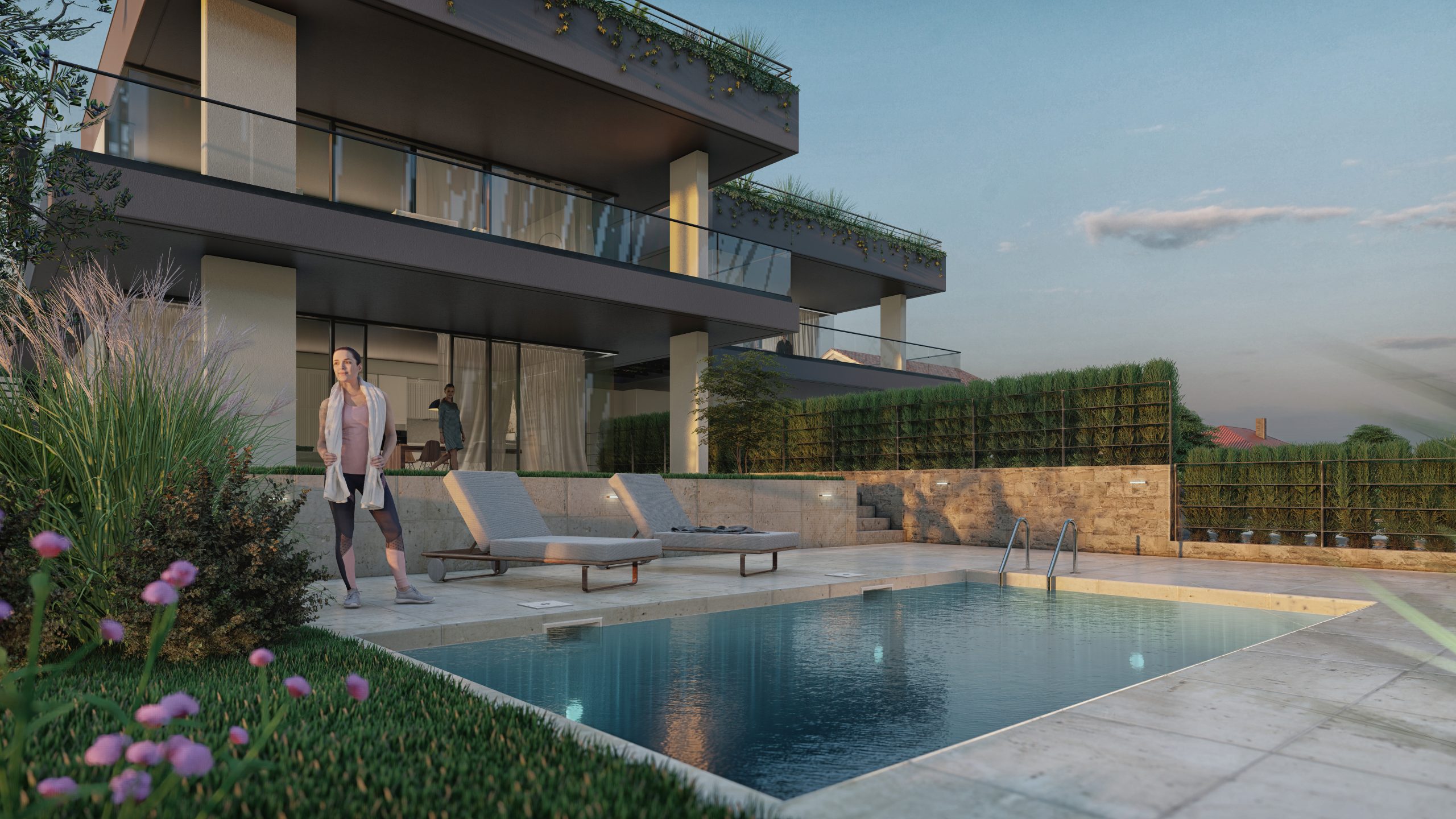 Il nuovo edificio si adatta con naturalezza all’andamento del terreno, sviluppandosi su quote differenziate per limitare gli sbancamenti e ridurre l’impatto visivo. L’altezza complessiva risulta inferiore a quella dell’edificio esistente, preservando i coni visuali e il paesaggio circostante. Completano l’intervento autorimesse interrate schermate da opere verdi, piscine pertinenziali e una scelta di materiali sobri ed eleganti, capaci di dialogare armoniosamente con il contesto naturale.
